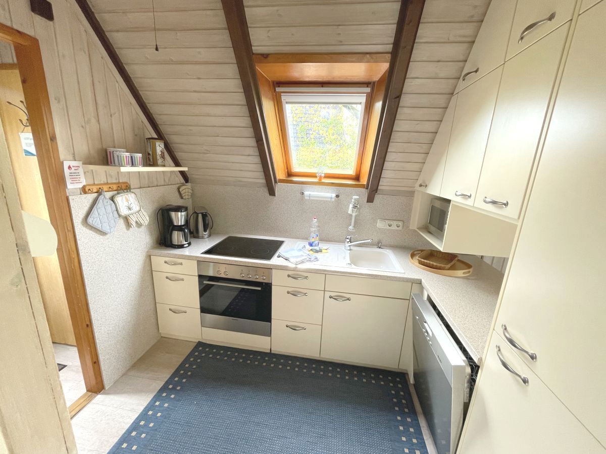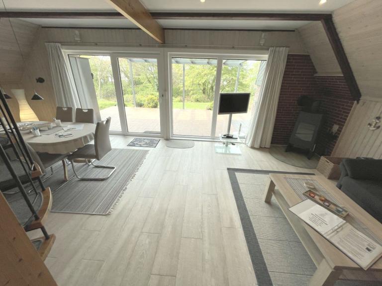• Im Erdgeschoß befinden sich ein Schlafzimmer mit Doppelbett, das Duschbad, die Küche und das Wohn-/Esszimmer mit Kamin, Smart-TV, DVD-Player und Musikanlage.