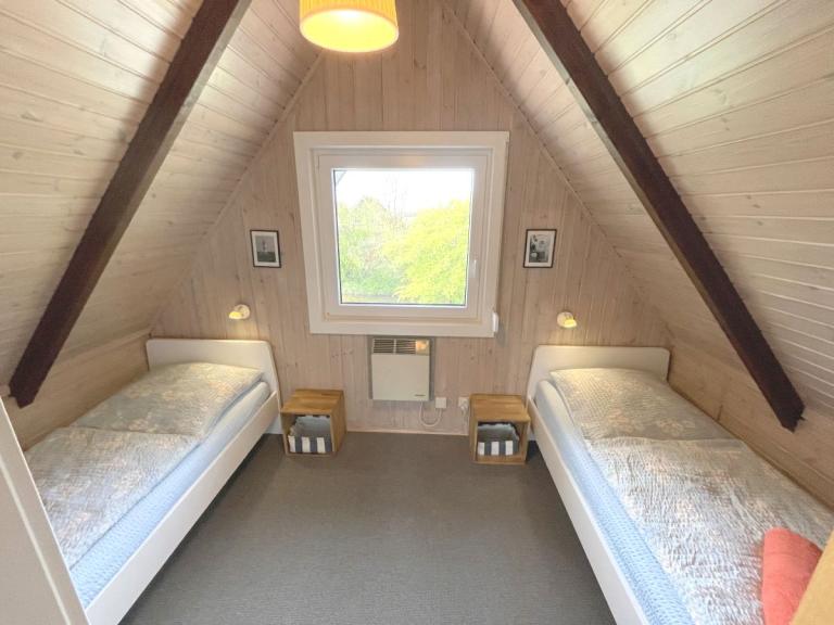 • Im Obergeschoß befindet sich 1 Schlafraum mit 2 Einzelbetten 200x90cm, 1 Freizeit-/Ruhezimmer mit TV und Schlafcouch sowie ein zusätzliches WC.